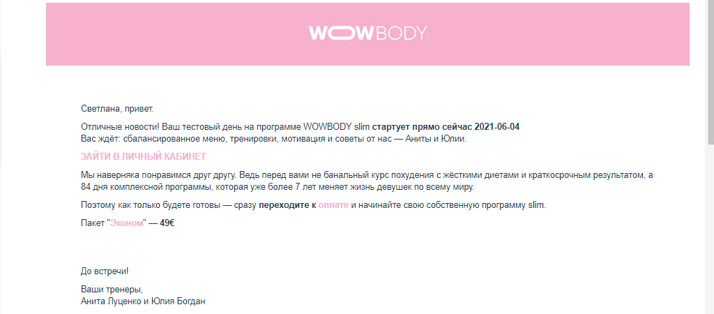 Далі потенційного покупця продовжують мотивувати оплатити курс. Для цього йому пропонують допомогу тренера у виборі програми і відео з підтвердженням ефективності тренувань.