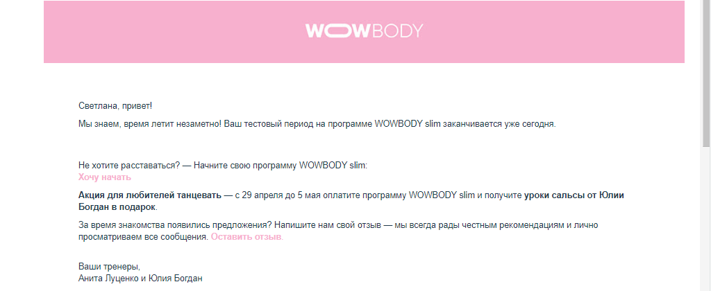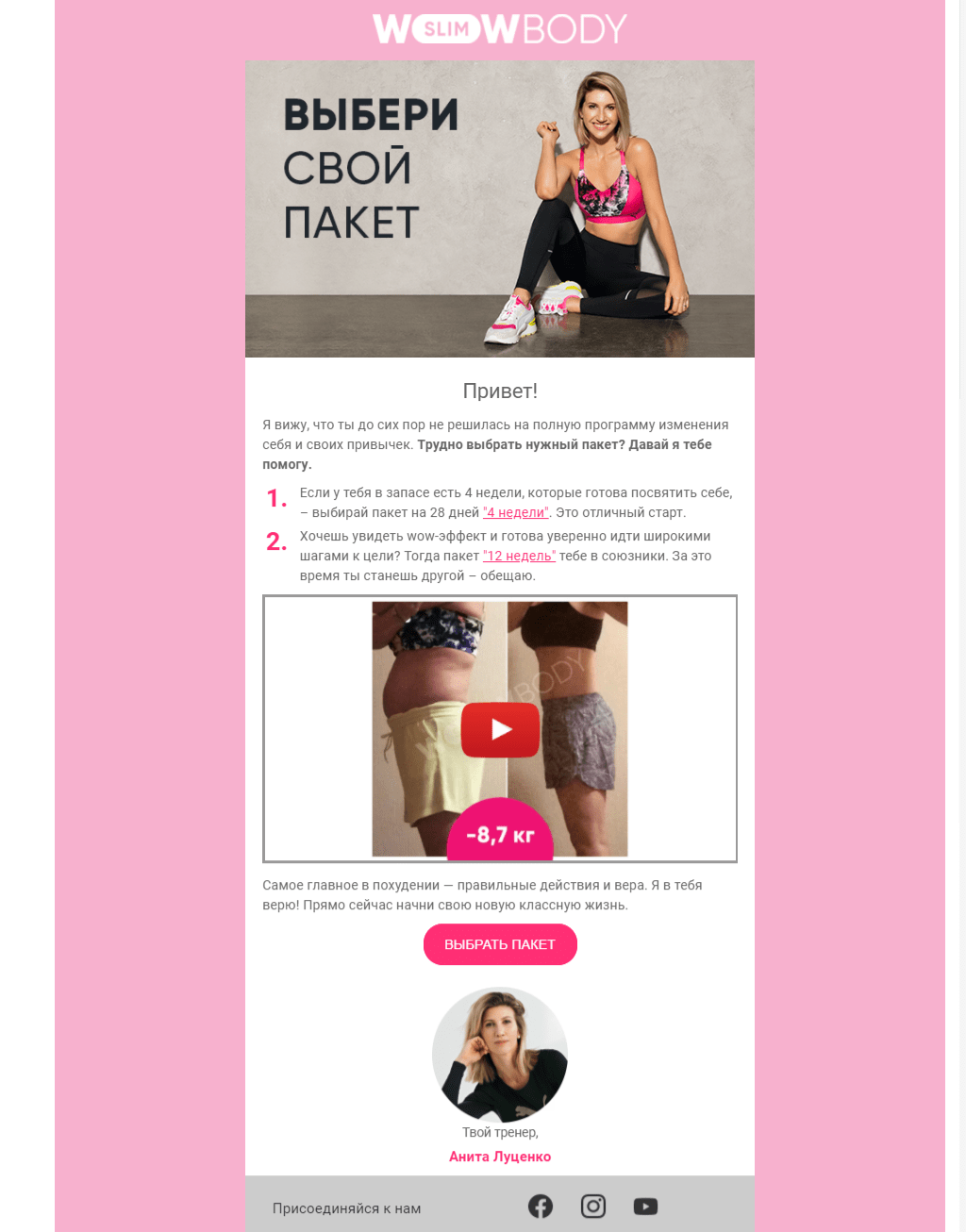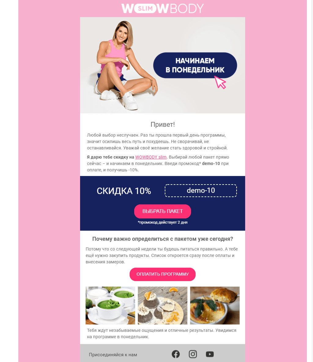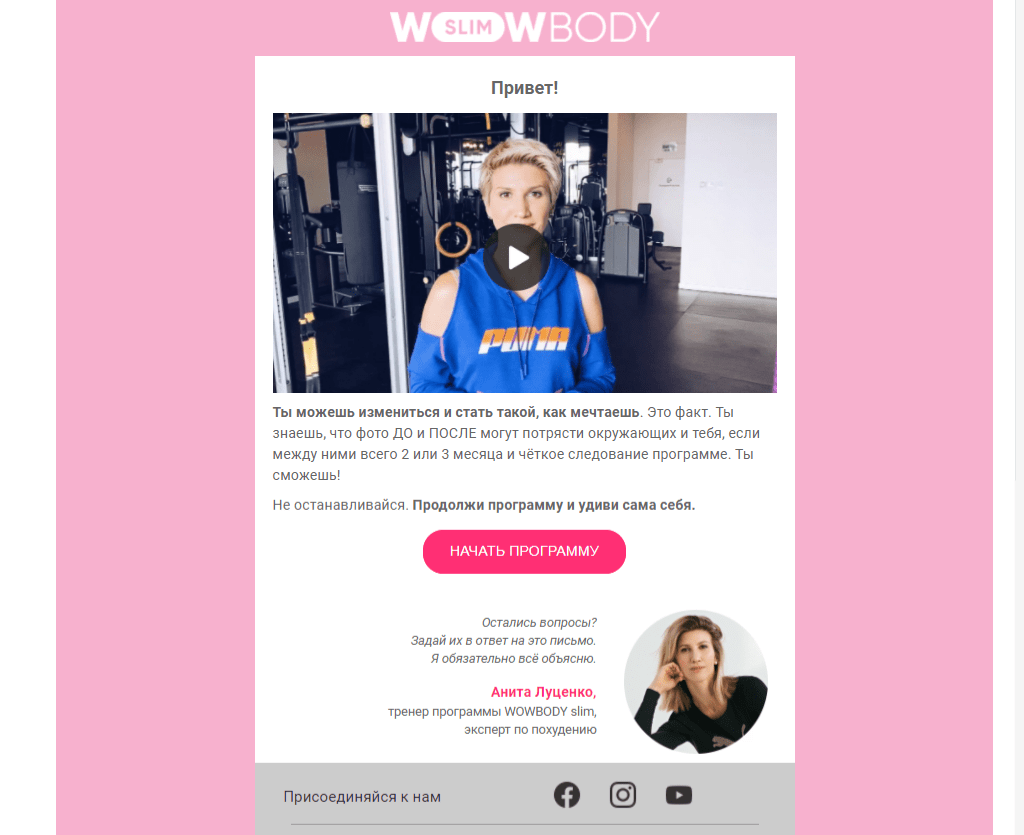 Якщо користувач все ще вирішується і не поспішає оплачувати повний курс, йому відправляють мотиваційне відео з чітким закликом до дії. У цій розсилці активно використовують тригери у вигляді слів підтримки, які стимулюють прийняття рішення. В кінці листа додані кнопки соціальних мереж, щоб створити додаткові точки дотику з передплатником і утримати його навіть якщо він перестане відкривати email повідомлення.