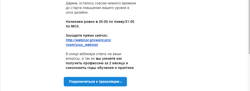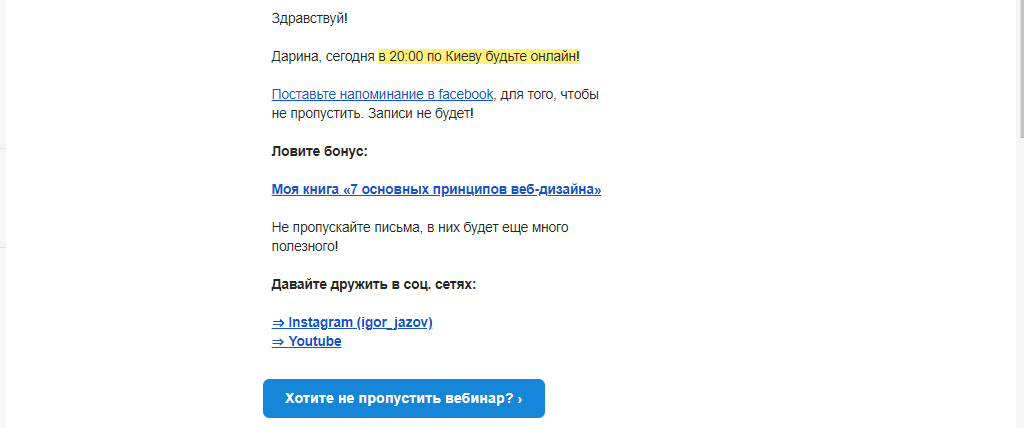 Щоб учасник точно відвідав вебінар, в цей же день, приблизно за годину до вебінару йому надсилають ще один лист, в якому розповідають про відповіді, які можна отримати якщо подивитися прямий ефір до кінця.