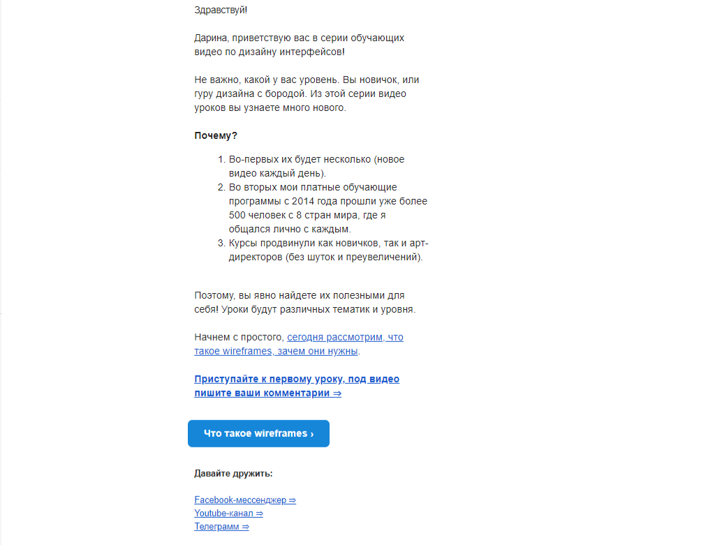 На наступний день по учасникам вебінару роблять розсилку, в якій повідомляють про старт серії навчальних відео для вивчення дизайну інтерфейсів.
