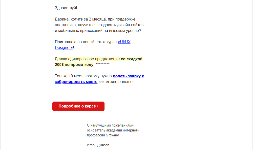 Після відправки уроків в чотирьох листах, які щодня приходять на пошту, потенційному клієнту пропонують стати учасником двомісячного курсу «UI/UX Designer». Для мотивації до прийняття рішення в листі використовують знижку в 200$ за промокодом. Така пропозиція стимулює почуття втраченої вигоди у передплатників, що підвищує продажі.