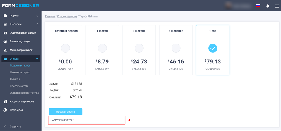 Для того щоб отримати знижку, необхідно вибрати потрібний тариф і період оплати, і клікнути по посиланню "У мене є промокод":