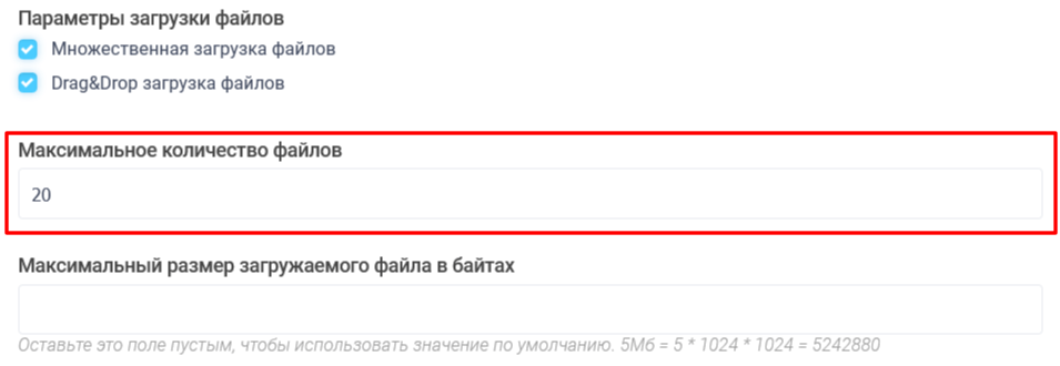 Також ви можете налаштувати і максимальну кількість файлів, яку можна завантажити в форму. Для цього в налаштуваннях елемента форми "Файл" з'явилося окреме поле: