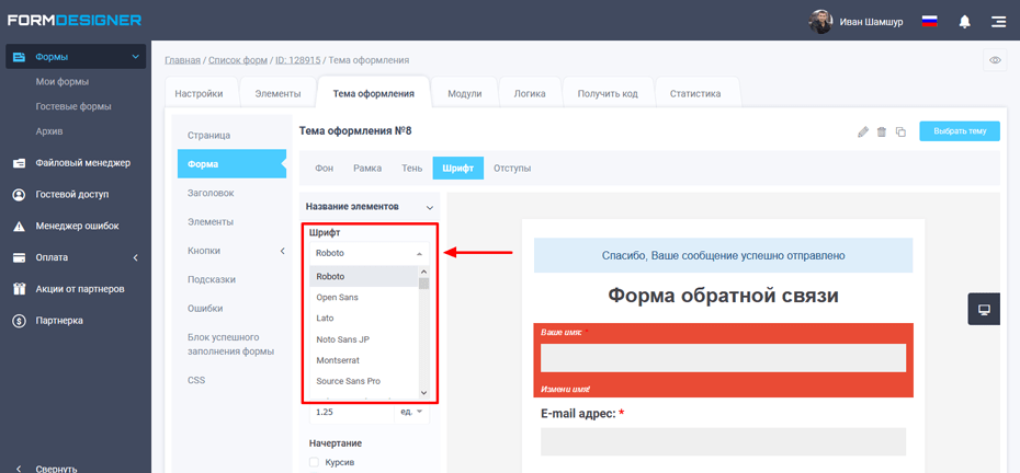 І ось сьогодні ми додали повну підтримку гугл шрифтів в наших формах. Тепер в темі оформлення в списку шрифтів ви можете знайти будь-який потрібний вам шрифт:
