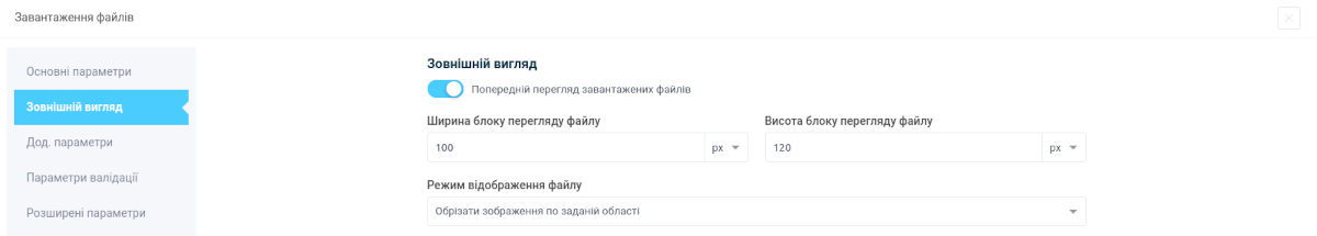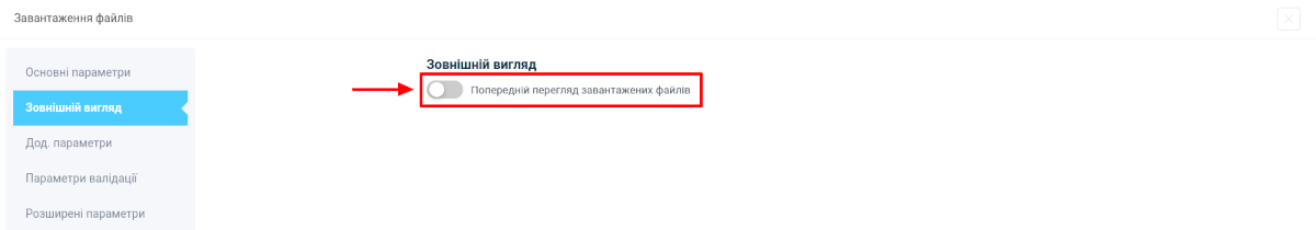 На прохання багатьох користувачів додали можливість включити попередній перегляд завантажуваних файлів у формі. Для цього, в Налаштуваннях елемента, необхідно перейти в розділ "зовнішній вигляд" і там Активувати перемикач "Попередній перегляд завантажених файлів":