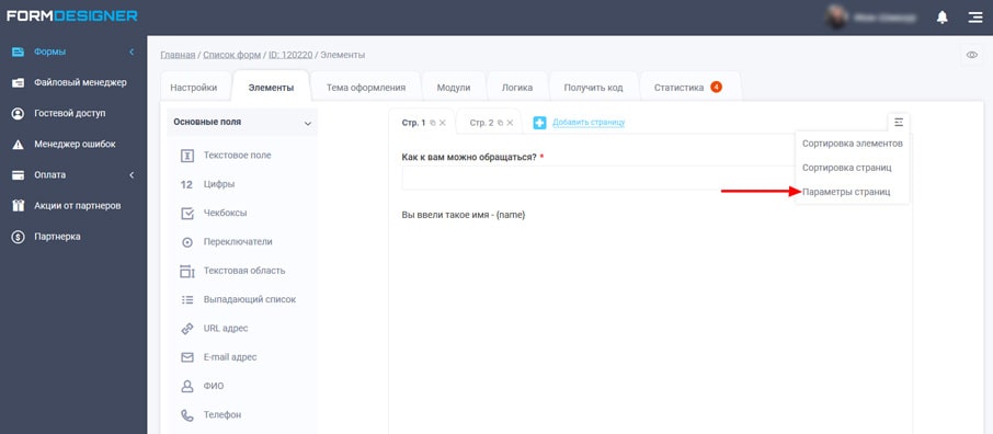 Для того щоб була можливість активувати покрокову форму, на початку потрібно додати у форму кілька сторінок. Після чого вам стануть доступні параметри сторінок :