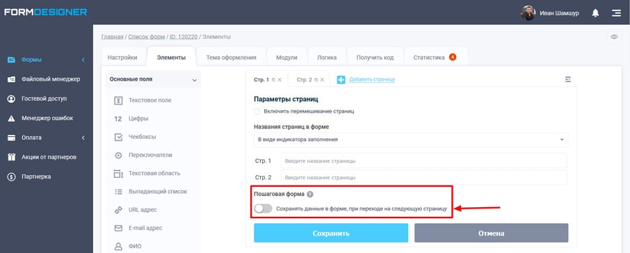 Тут потрібно в розділі “Покрокова форма” активувати перемикач “Зберігати дані у формі, при переході на наступну сторінку” , після чого необхідно зберегти зміни у формі.